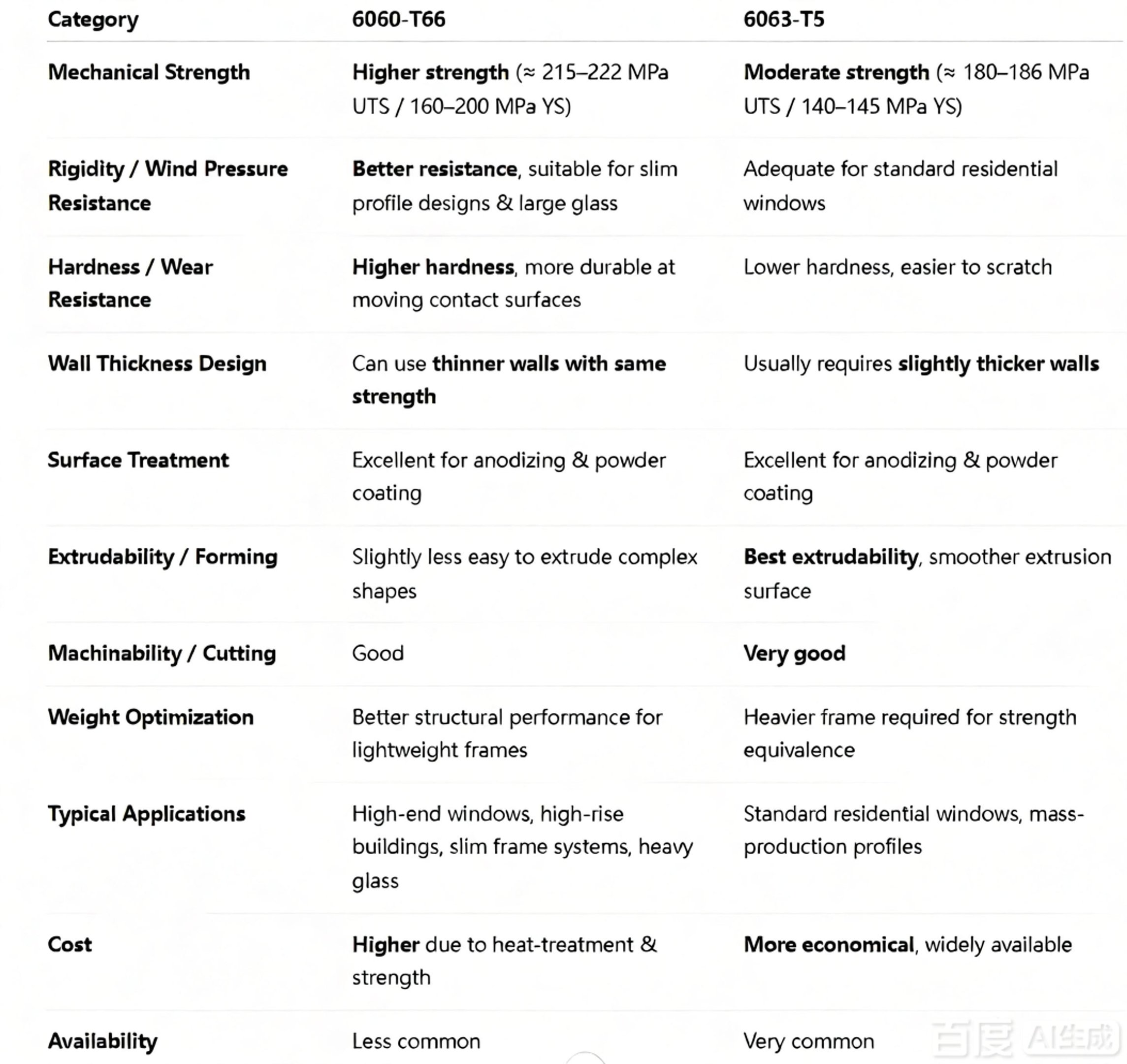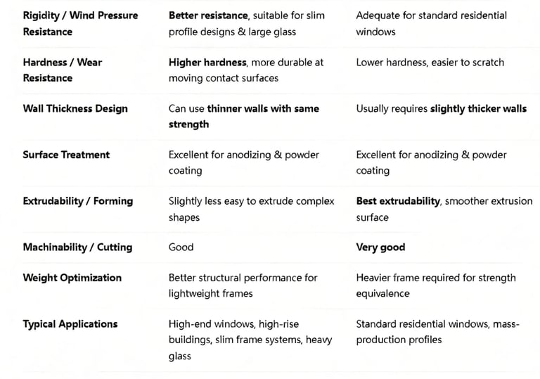 Category 6060-T66 6063-T5 Mechanical Strength Higher strength (≈ 215–222 MPa UTS / 160–200 MPa YS) Moderate strength (≈ 180–186 MPa UTS / 140–145 MPa YS) Rigidity / Wind Pressure Resistance Better resistance, suitable for slim profile designs & large glass Adequate for standard residential windows Hardness / Wear Resistance Higher hardness, more durable at moving contact surfaces Lower hardness, easier to scratch Wall Thickness Design Can use thinner walls with same strength Usually requires slightly thicker walls Surface Treatment Excellent for anodizing & powder coating Excellent for anodizing & powder coating Extrudability / Forming Slightly less easy to extrude complex shapes Best extrudability, smoother extrusion surface Machinability / Cutting Good Very good Weight Optimization Better structural performance for lightweight frames Heavier frame required for strength equivalence Typical Applications High-end windows, high-rise buildings, slim frame systems, heavy glass Standard residential windows, mass-production profiles Cost Higher due to heat-treatment & strength More economical, widely available Availability Less common Very common